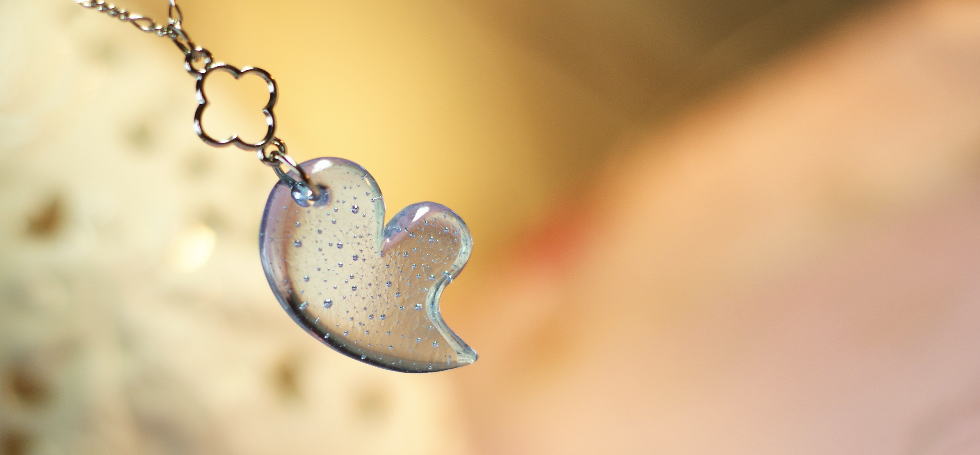 落として紐を通す部分が破損されてしまわれた、お嬢様がアメリカ旅行で購入された思い出の大切なガラスのハートのペンダント。破損された部分を接着し再びご愛用いただける形にリペアいたしました。
