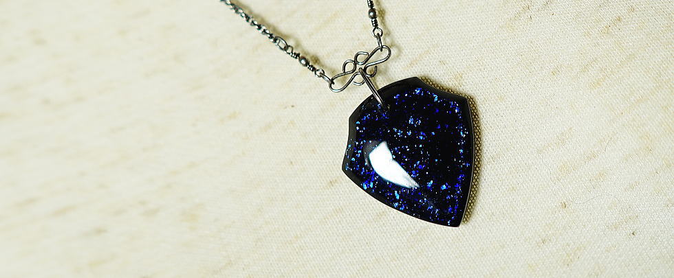 破損されたお手持ちの大切な「MANUELA ZANVETTORI」のペンダント。空洞の破損されたガラスパーツの破損箇所を整え、ワイヤーを交換・華やかなイメージのゴールドパーツやビーズを追加、破損された部分を黒い樹脂で金継ぎ風に仕上げ、リペア・リメイクいたしました。