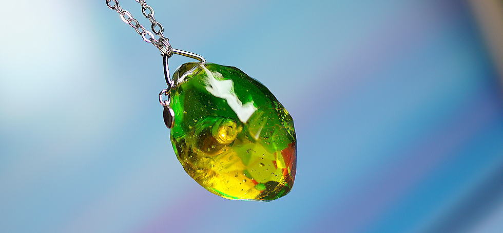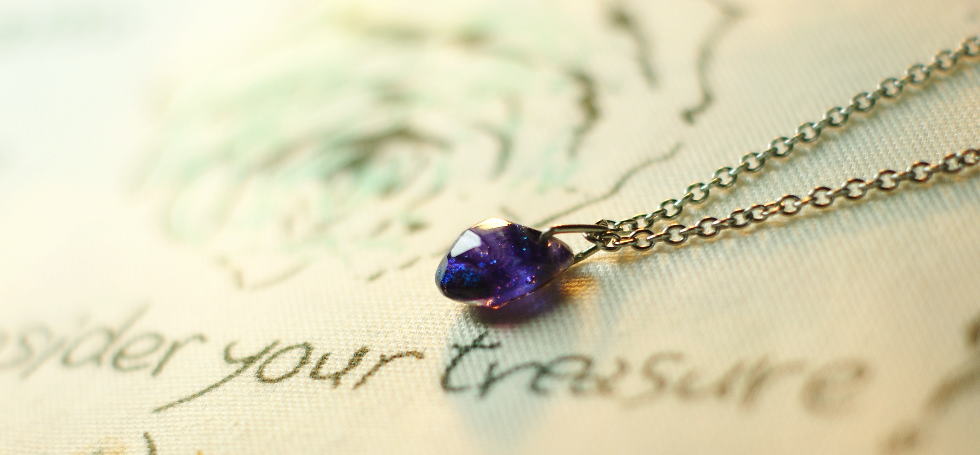 大切なお手持ちのしずくのようなペンダントトップ。2つに割れてしまったトップとチェーンを通す部分をひとつにし、クリアーコーティングしてリペアいたしました。