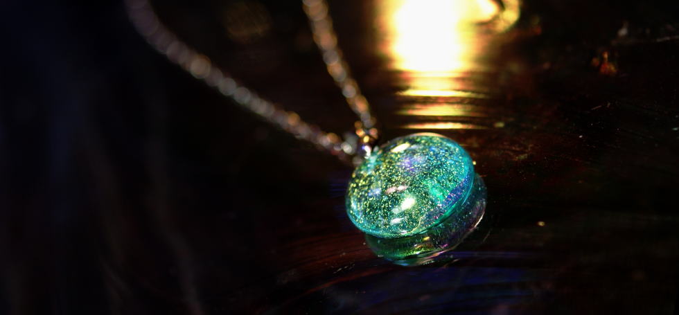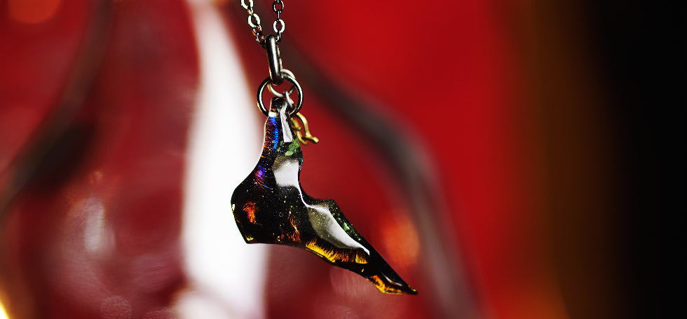 前回リペア・リメイクをさせていただいたバルザスのリングのパーツが外れてしまわれたため、その際のガラスリングの破片を利用しパーツを作成・設置、さらに破片をペンダントへとリメイクして仕上げてまいりました。