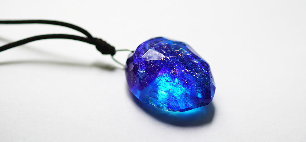 お手持ちのウルトラマンのエンブレムのペンダント。プラスチック製のモチーフ部分を、1点もののガラス製トップを制作し設置して、世界にひとつのペンダントにリメイクいたしました。