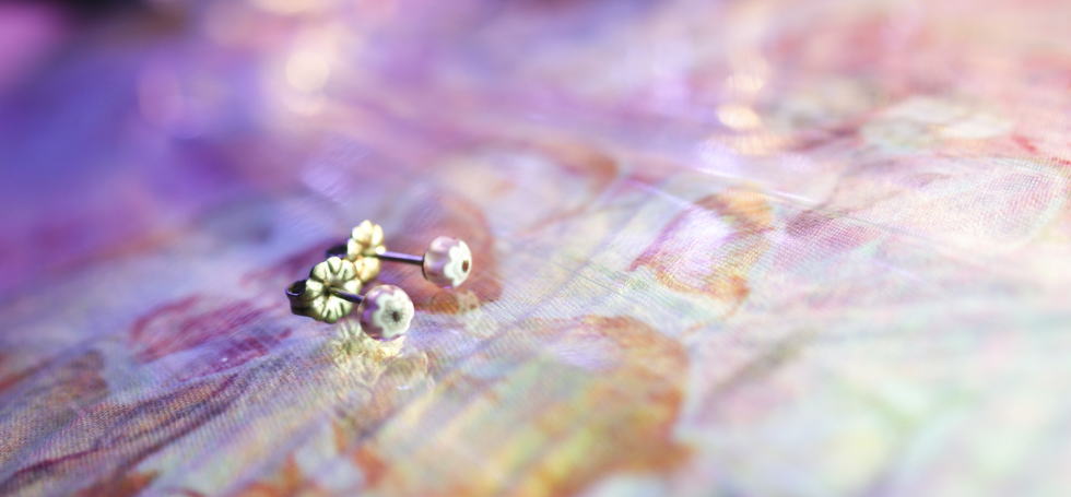 落として破損されてしまわれた大切な方から頂いたお気に入りのガラスのリング。リング部分をカット、鋭利な部分を危険の無い様に丸みを持たせ、形を整えて磨き、新たに左右セットのオリジナルピアスとしてリメイクいたしました。