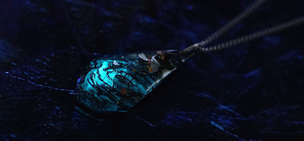 破損された思い出の琉球ガラスのグラス。新たに形を変えて世界にひとつのエンブレムペンダントへとリメイクいたしました。作品集の方に『煌く美ら海のMemory / ペンダント』としてアップしております。
