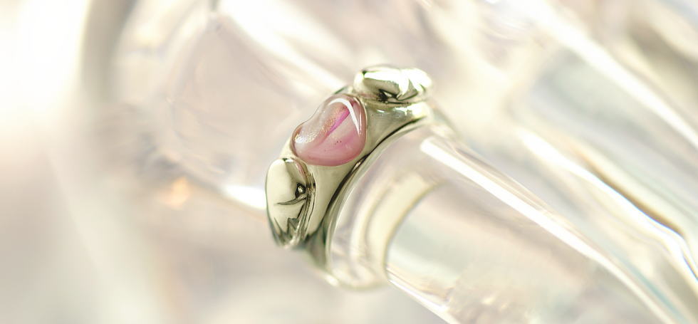 ご主人から頂いた破損されてしまわれた大切なガラスのリング。4mmφのガラス玉を制作し、BARZAZ(バルザス)の可愛らしいK10ピンクゴールド製スマイルリングに設置してリメイクいた(しました。取り外した3mmφのアコヤ真珠はピアスへとリメイクいたしました。